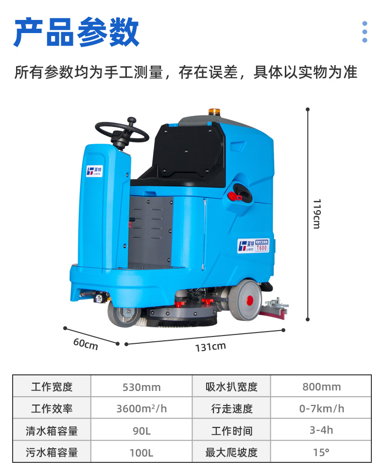 莱特工业洗地机T600型,机身尺寸:1370*800*1300mm,吸水扒宽度:1000mm,额定电压:DC24V,工作效率:3600m²/h,标配电池容量:100A,连续工作时间:3-4h,工作宽度:530mm,刷盘转速:150rpm,刷盘功率:550W,吸水功率:600W,行走功率:1000W,行走速度:0-7km/h,清水箱容量:90L,污水箱容量:100L,声级:60dB(A),整车重量:201kg。具备:全自动升高和降低刷盘、吸水扒;倒车自带吸水趴和刷盘升降功能;污水箱满了自动停机功能;配有水量显示器,可直观观察水位变化;电磁刹车装置,坡道上停车时不会溜车,更安全;采用双控制器系统控制整车电控,维修简单快捷;浮球滤网+传感器双重保护设计可防止污水进入真空电机;更轻便小巧,适用于较小的场所,可直接进出电梯,方便清洗不同楼层;两个注水口设计:大注水口可实现快速注水,小注水口适用于远距离注水;污水箱易清洗。静音设计,适用于对声音敏感的环境,如办公场所,医院;吸水扒易装卸,遇到障碍物时自动脱落,可保护吸水扒,帮助机器顺利通过。